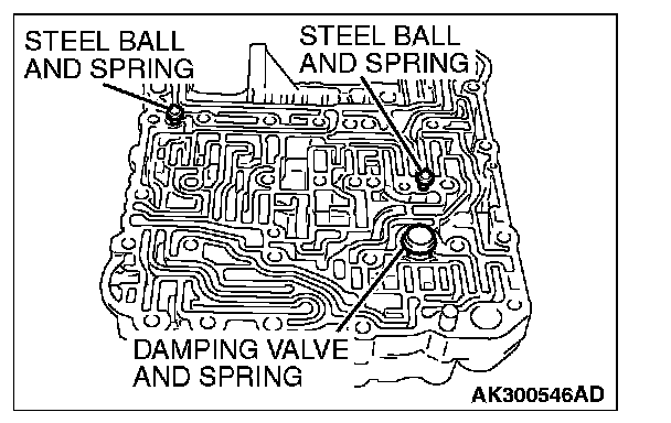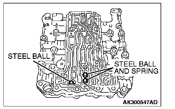 Install the steel balls (three pieces) and springs (two pieces) to the inside valve body as shown.