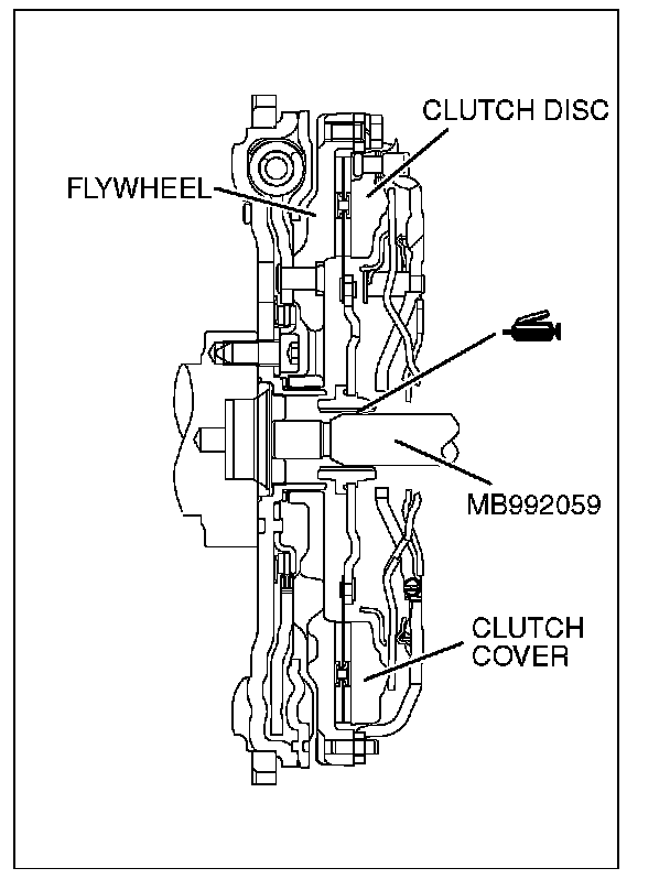 2. Using special tool MB992059 to position the clutch disc on the flywheel.