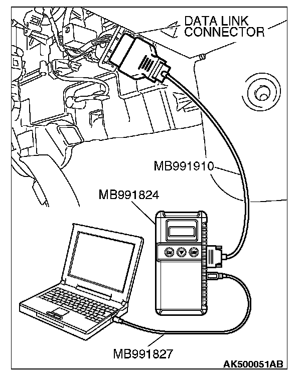CAUTION: To prevent damage to scan tool MB991958, always turn the ignition switch to the "LOCK" (OFF) position before connecting or disconnecting scan tool MB991958.