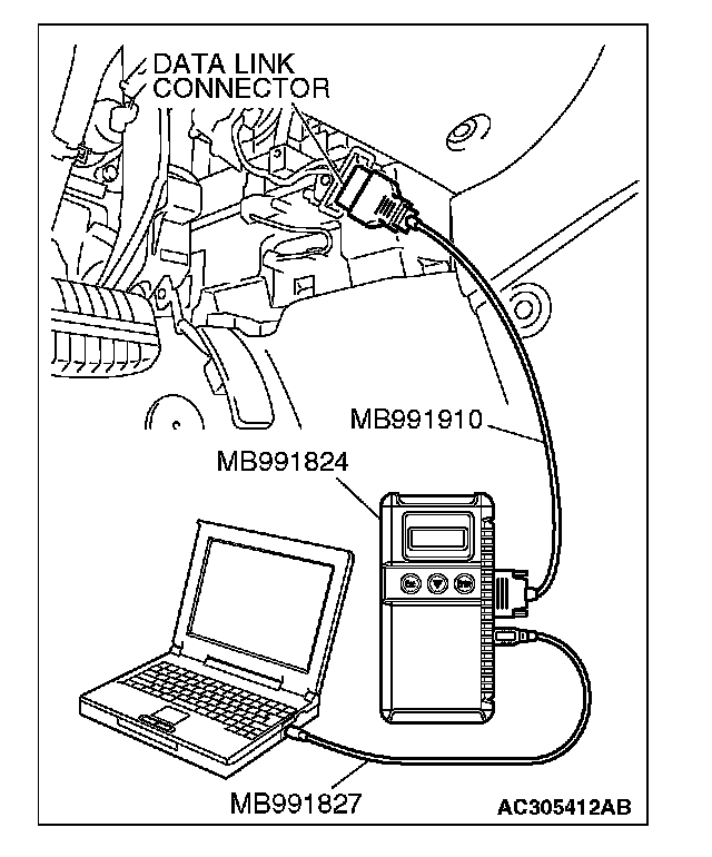 2. Turn the ignition switch to the "LOCK" (OFF) position and connect the scan tool MB991958 to the data link connector.