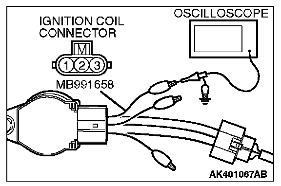 1. Disconnect the ignition coil connector, and connect test harness special tool (MB991658) between the separated connector. (All terminals should be connected.)