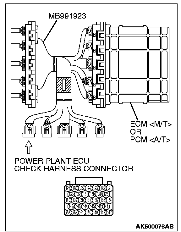 1. Disconnect all ECM [M/T] connectors or PCM [A/T] connectors. Connect the check harness special tool (MB991923) between the separated connectors.