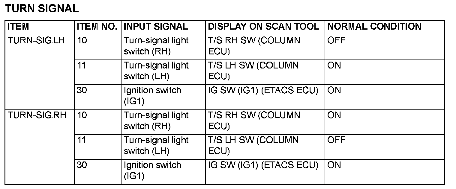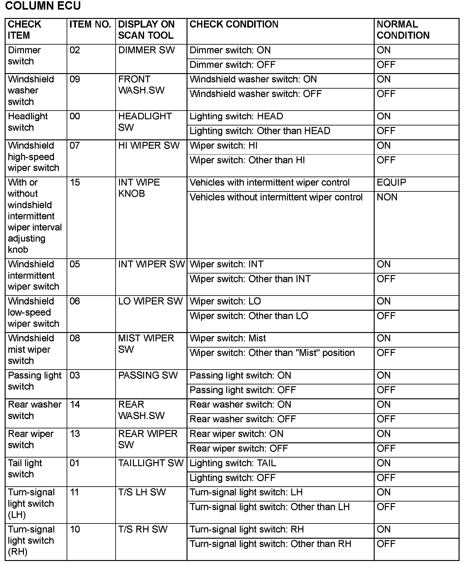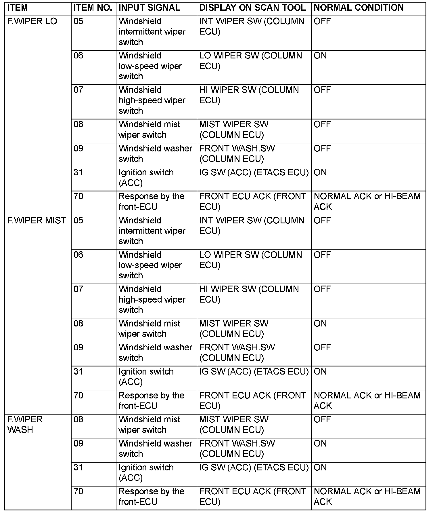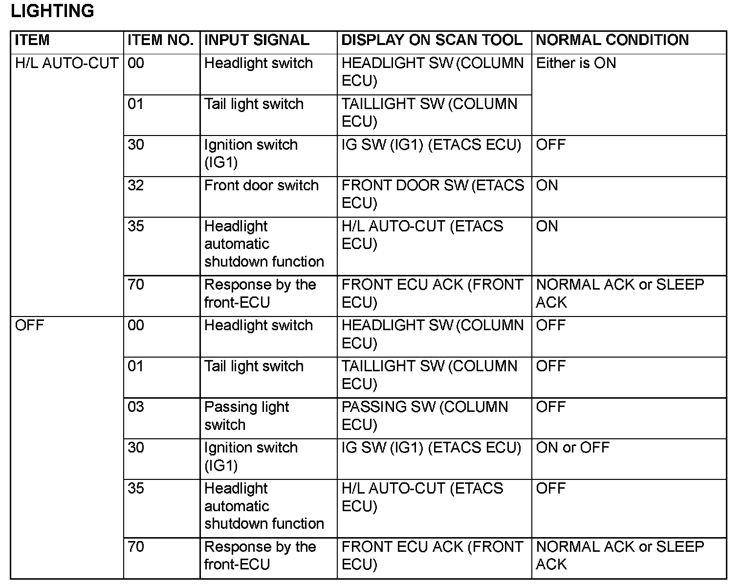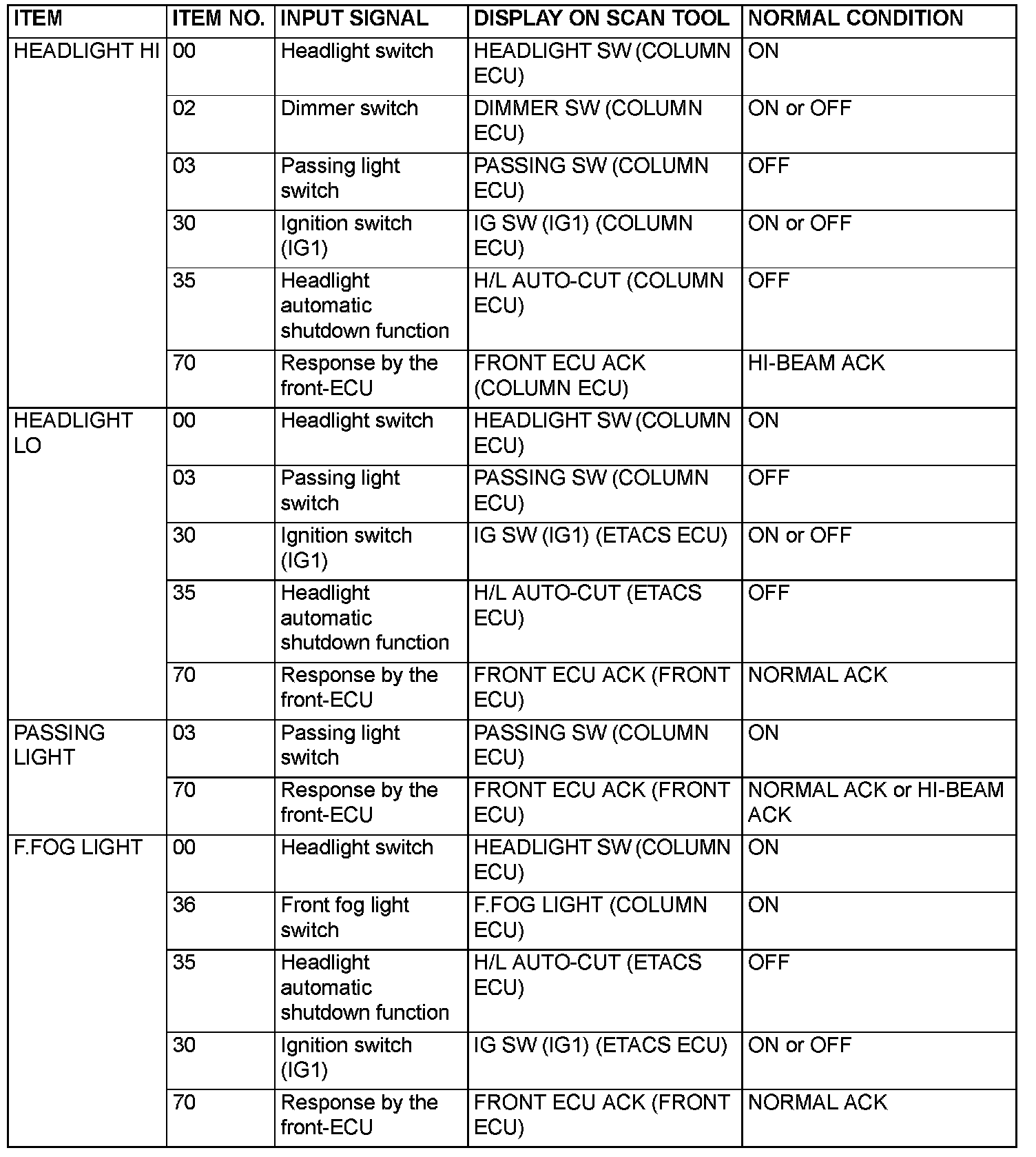 NOTE: When checking the input signals (off, tail, low-beam or high-beam), turn the ignition switch to the "ON" position in order to disable the headlight automatic shutdown function. However, the headlight operation does not depend on the ignition switch positions, the scan tool MB991958 (M.U.T.-III Sub Assembly) does not display the title "IGNITION SWITCH".
