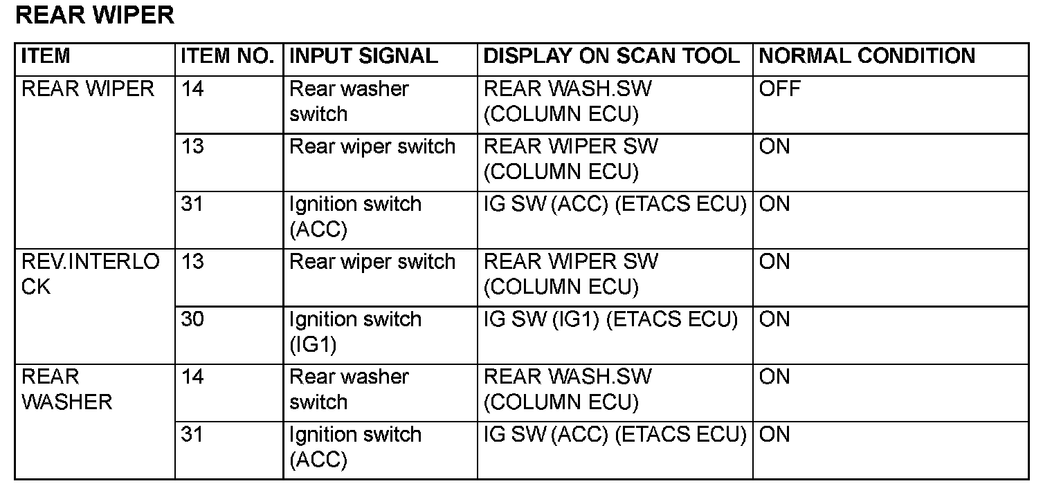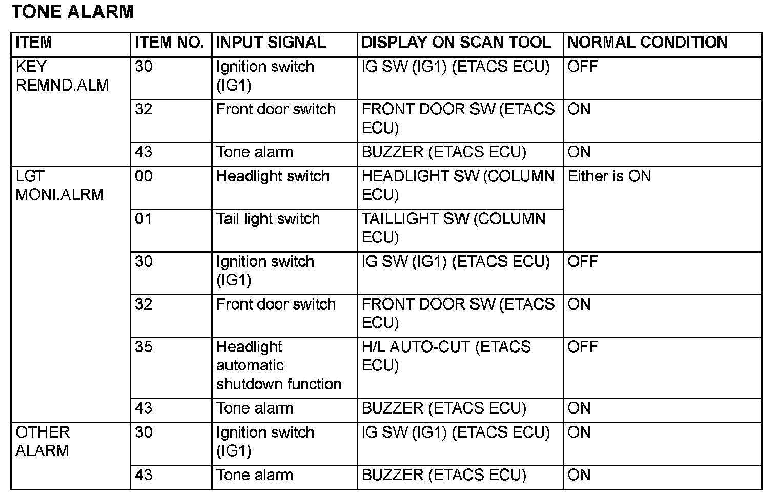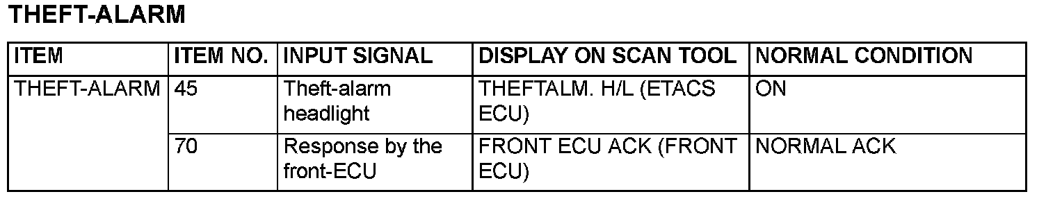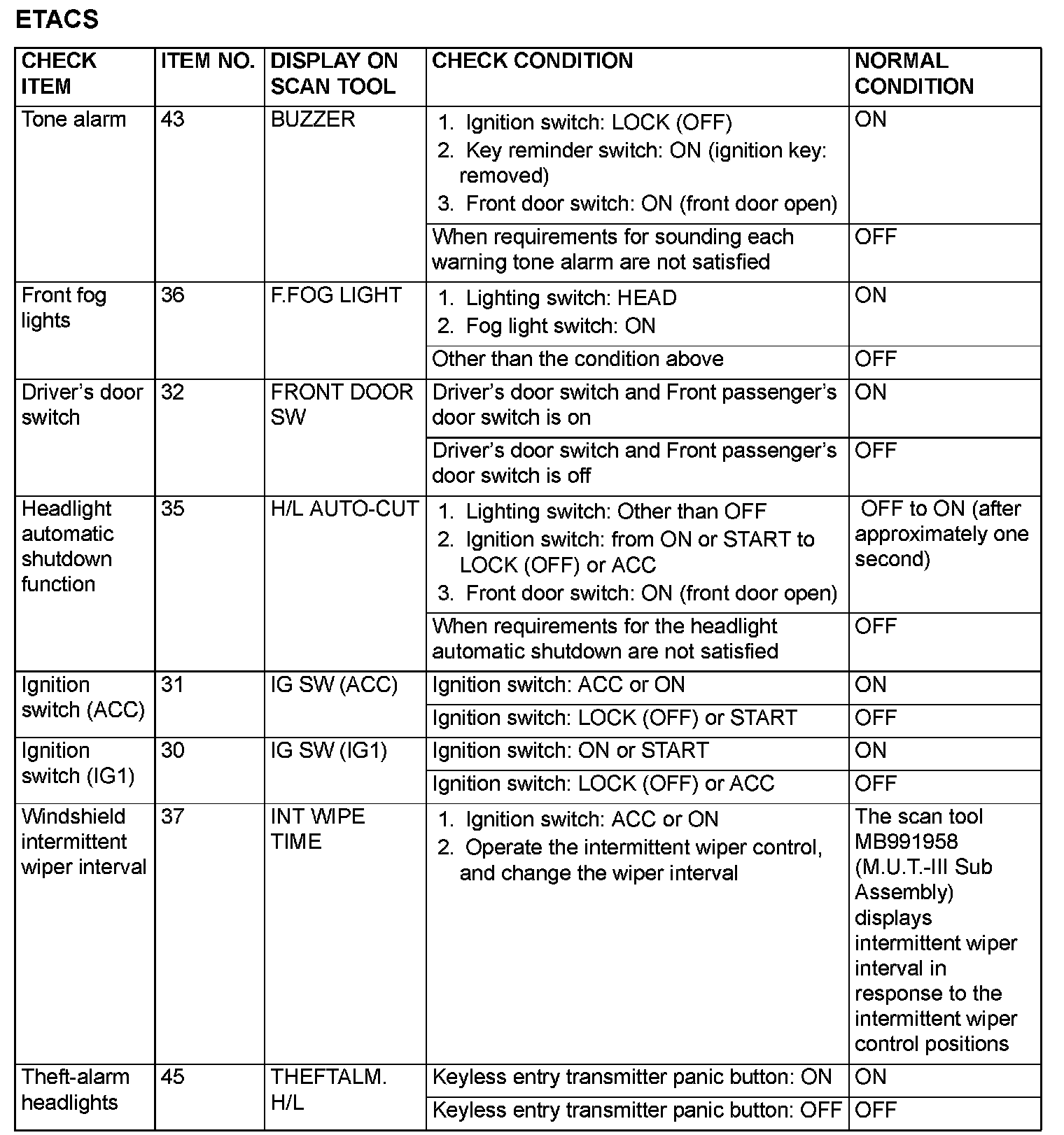 NOTE: For item No.43, the scan tool MB991958 (M.U.T.-III Sub Assembly) also displays "ON" when the light reminder tone alarm or the seat belt tone alarm function is triggered.