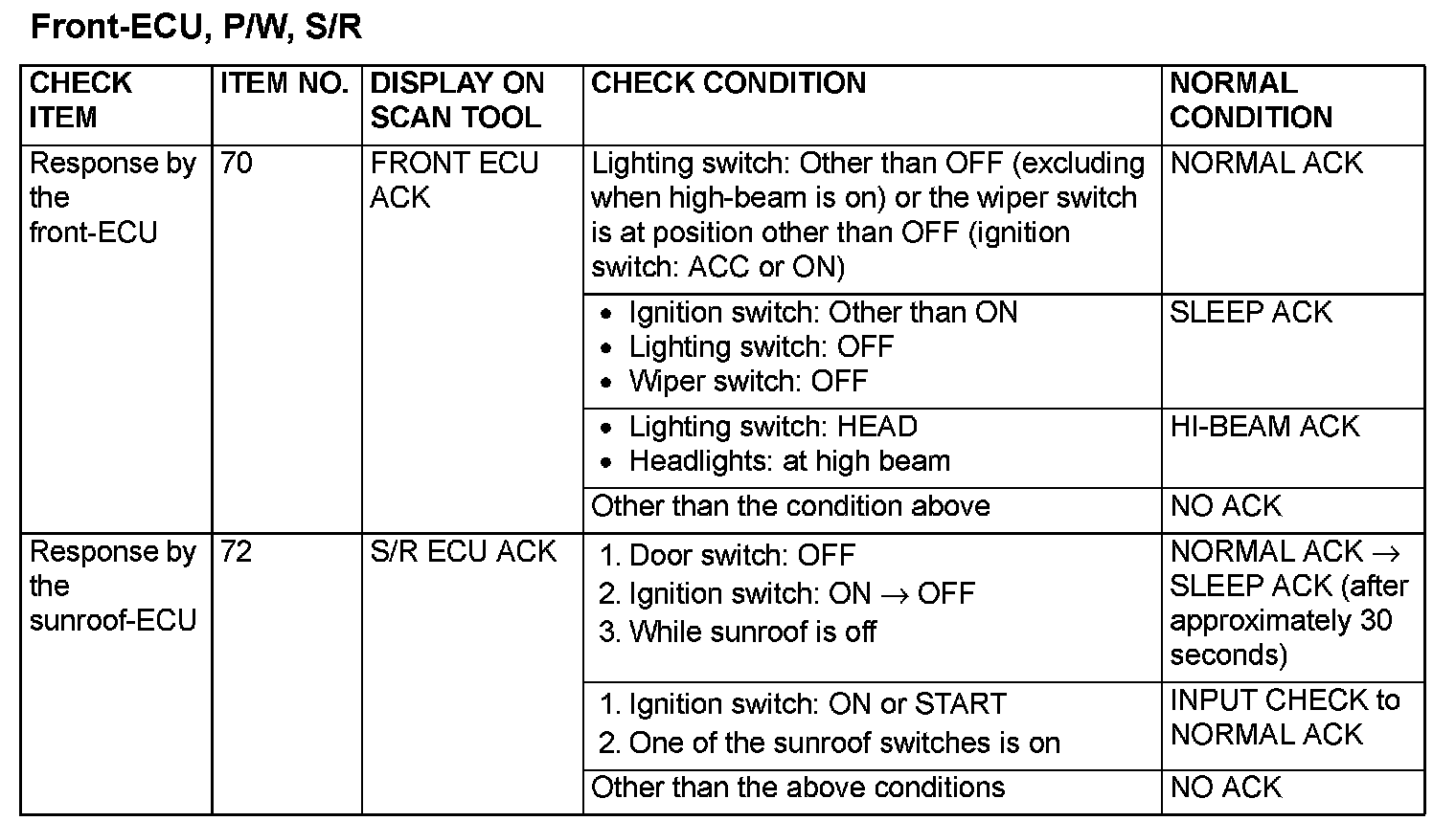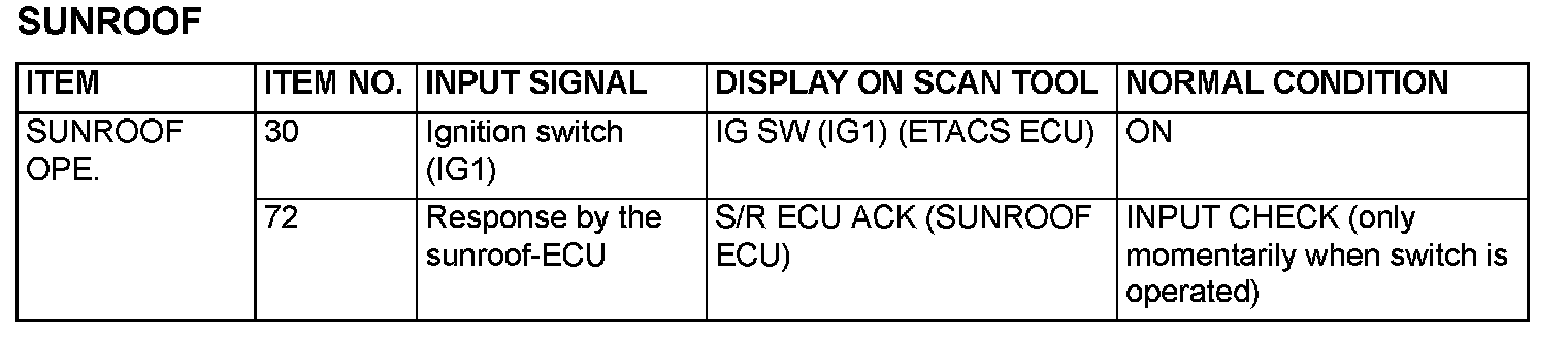 - For item No.72, the scan tool MB991958 (M.U.T.-III Sub Assembly) also displays "NG" under "ECU COMM Check" when it displays "NO ACK" under the sunroof-ECU check.