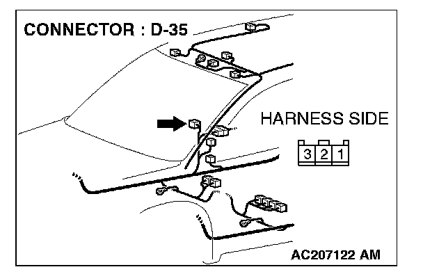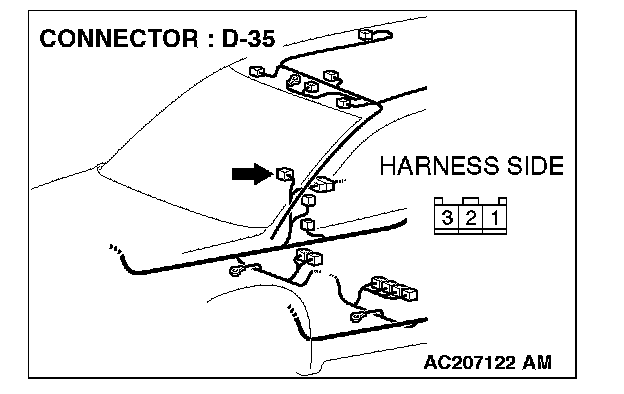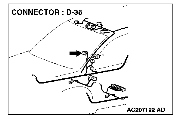 STEP 7. Check front door switch (RH) connector D-35 for loose, corroded or damaged terminals, or terminals pushed back in the connector.