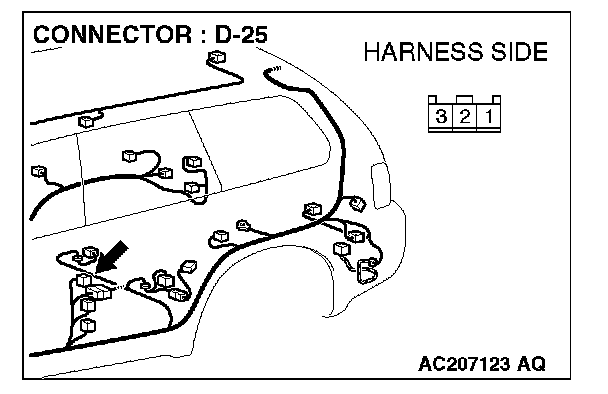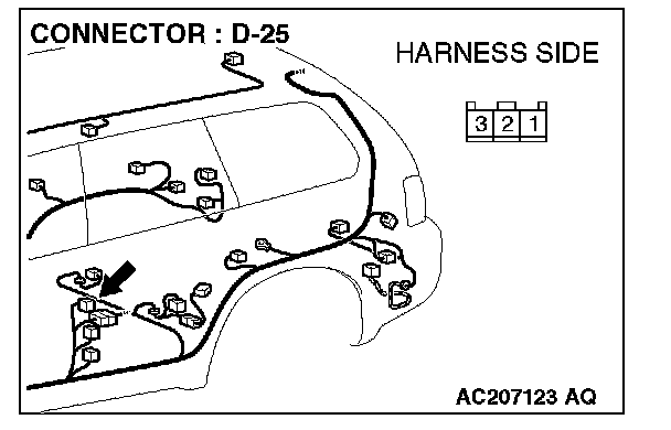 STEP 2. Check front door switch (LH) connector D-25 for loose, corroded or damaged terminals, or terminals pushed back in the connector.