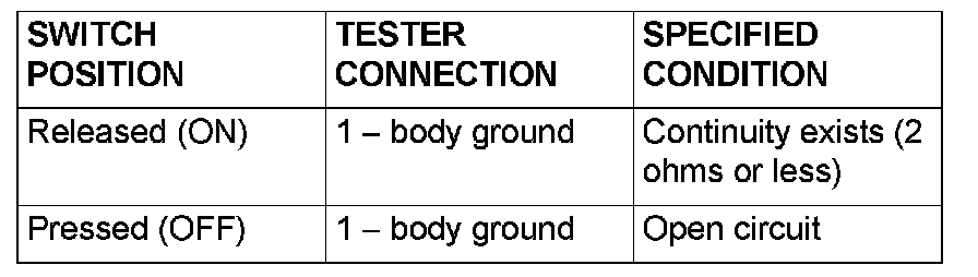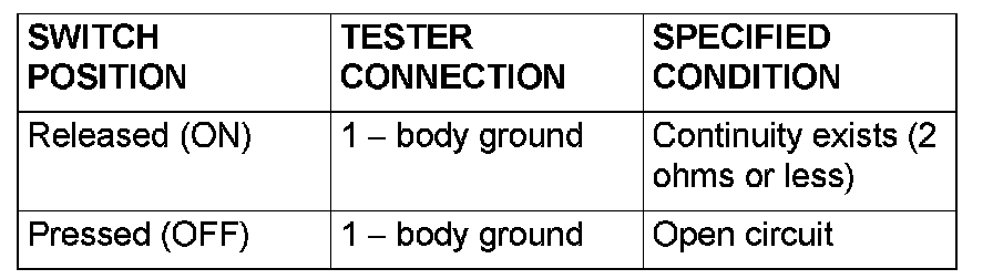 Remove the front door switch (LH). Then check continuity between the switch terminals and the body ground.