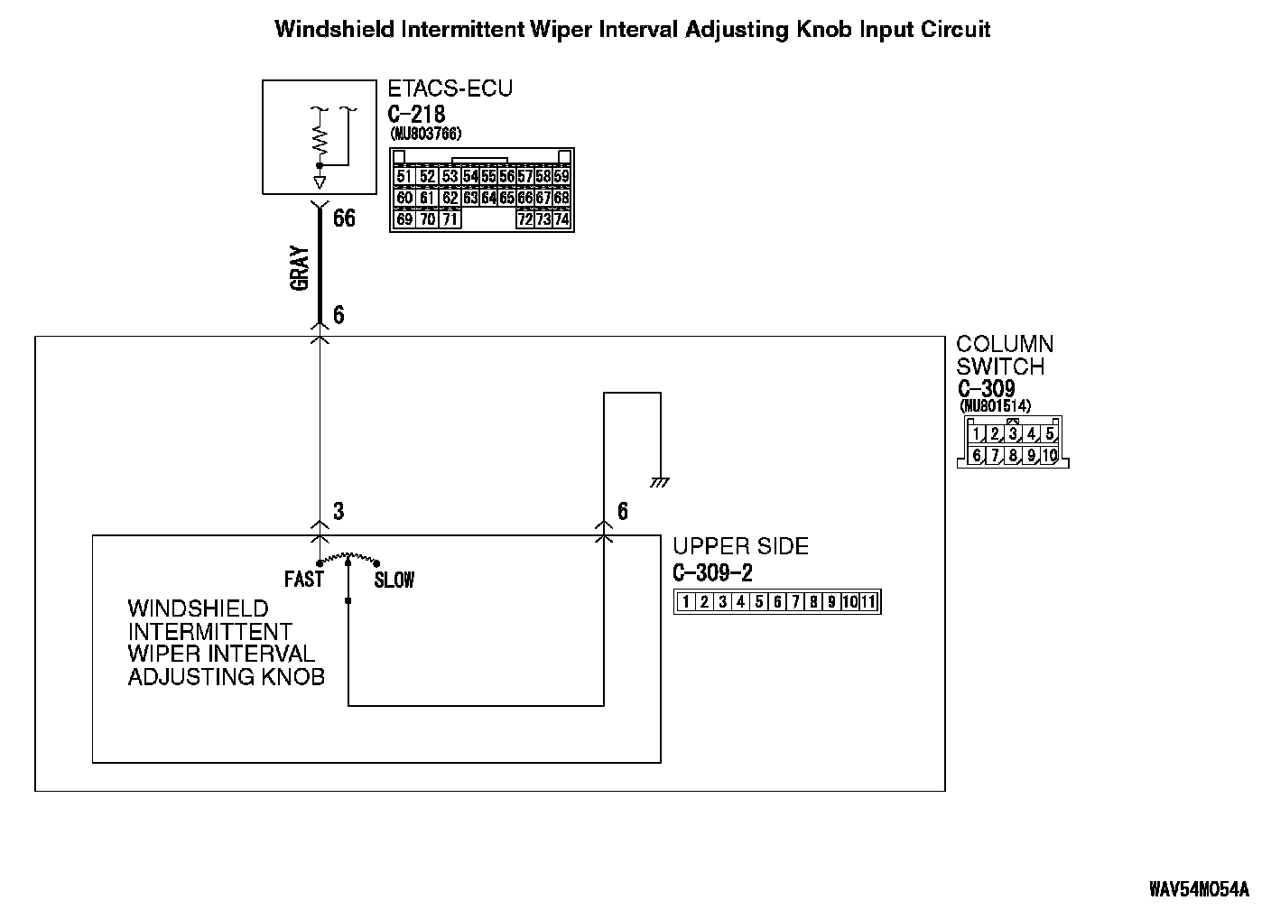 The ETACS-ECU calculates the windshield intermittent wiper interval according to the position of the variable intermittent wiper control switch, which is incorporated in column switch (windshield wiper and washer switch).