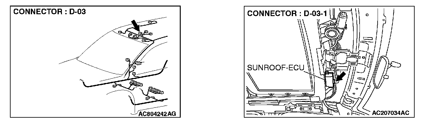 STEP 2. Check sunroof assembly connector D-03 and sunroof-ECU connector D-03-1 for loose, corroded or damaged terminals, or terminals pushed back in the connector.