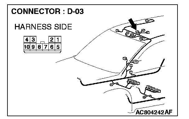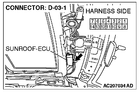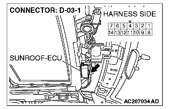 STEP 3. Check the wiring harness between sunroof assembly connector D-03 (terminal 10) and sunroof-ECU connector D-03-1 (terminal 5).