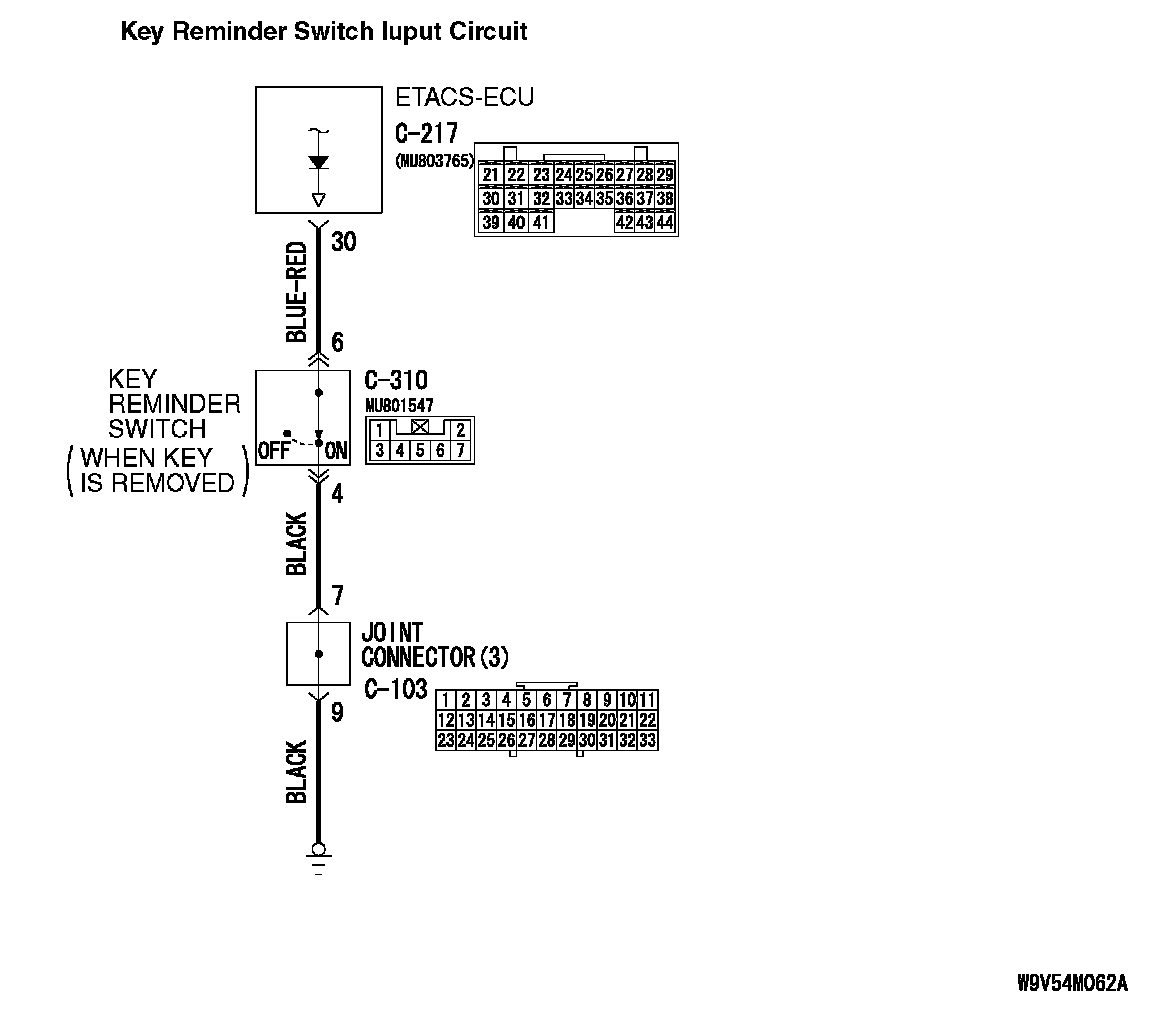 Q: Is the wiring harness between key reminder switch connector C-310 (terminal 9) and ETACS-ECU connector C-217 (terminal 30) in good condition?