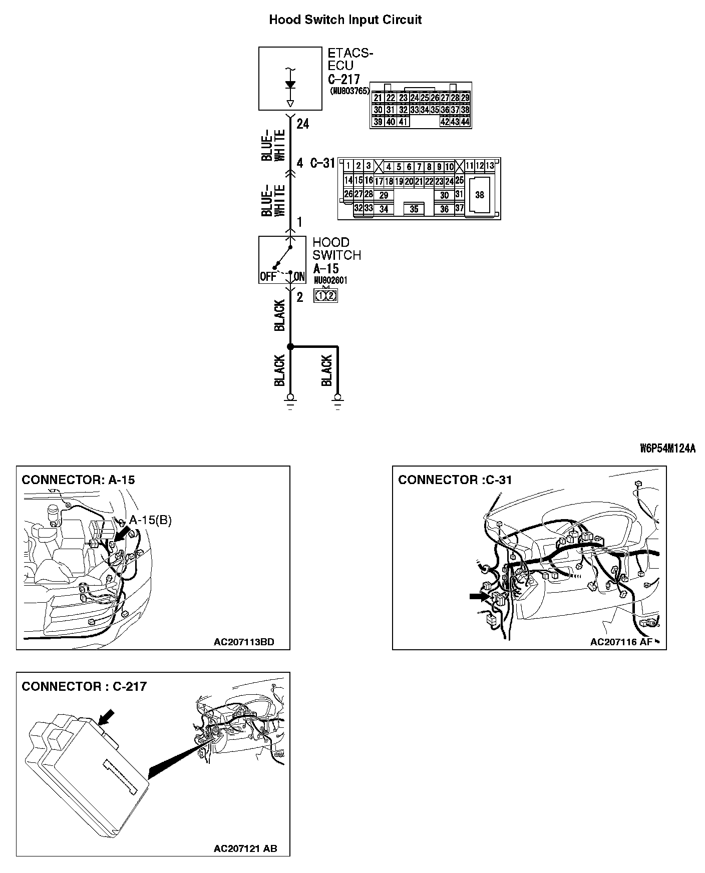 STEP 6. Check the wiring harness between hood switch connector A-15 (terminal 1) and ETACS-ECU connector C-217 (terminal 24).