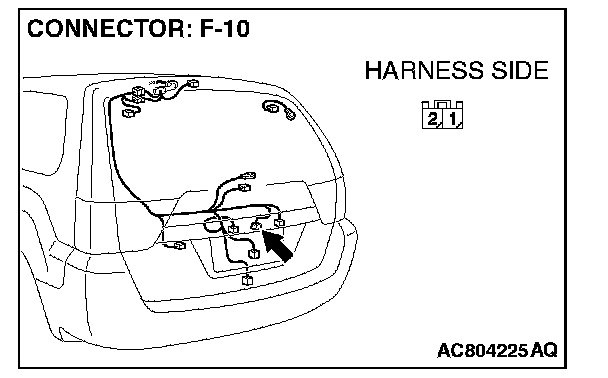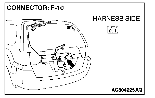 1. Disconnect liftgate opener switch connector F-10 and measure the resistance available at the harness side of the connector.