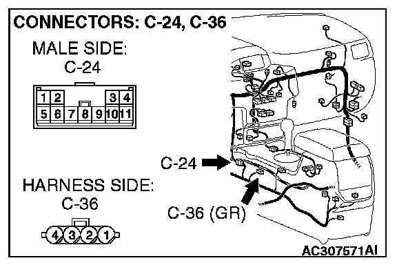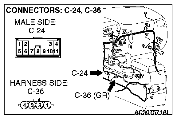 STEP 22. Check G and yaw rate sensor connector C-36 and intermediate connector C-24 for loose, corroded or damaged terminals, or terminals pushed back in the connector.CAUTION: The strand end of the twist wire should be within 10 cm (4 inches) from the connector.
