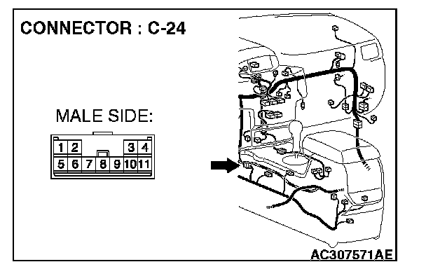 1. Disconnect intermediate connector C-24 and G and yaw rate sensor connector C-36, and measure the voltage at the wiring harness side of intermediate connector male side (at front wiring harness side).