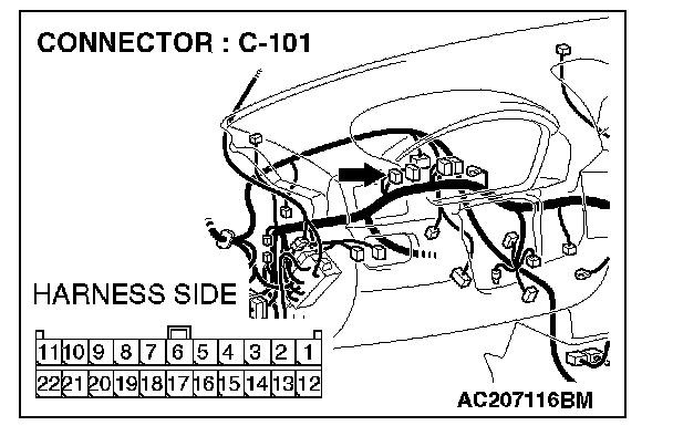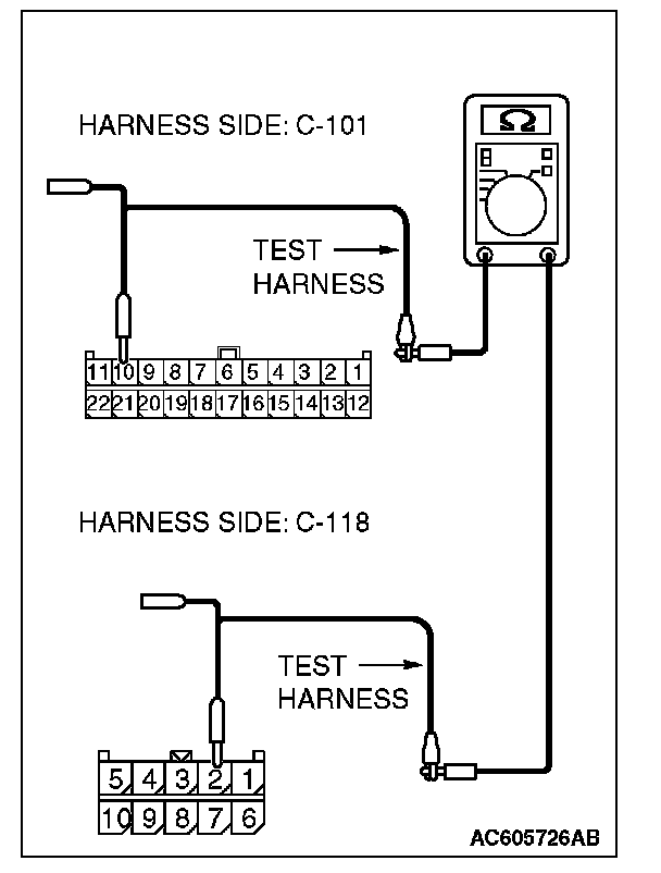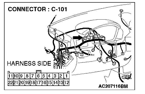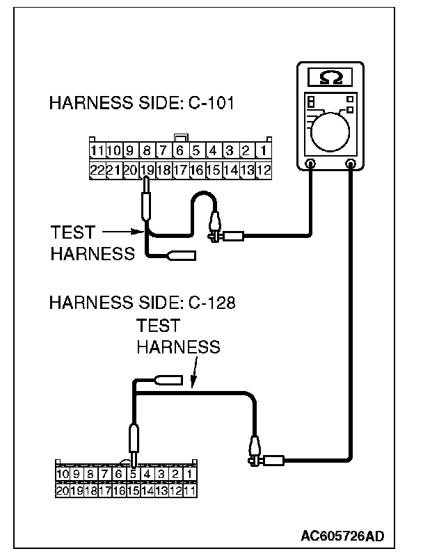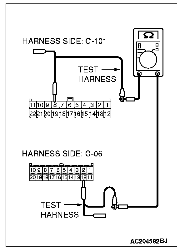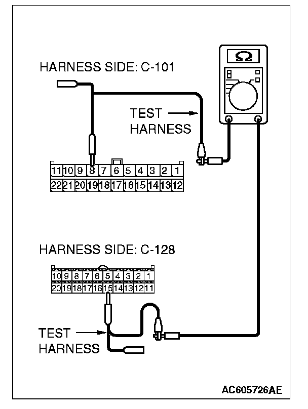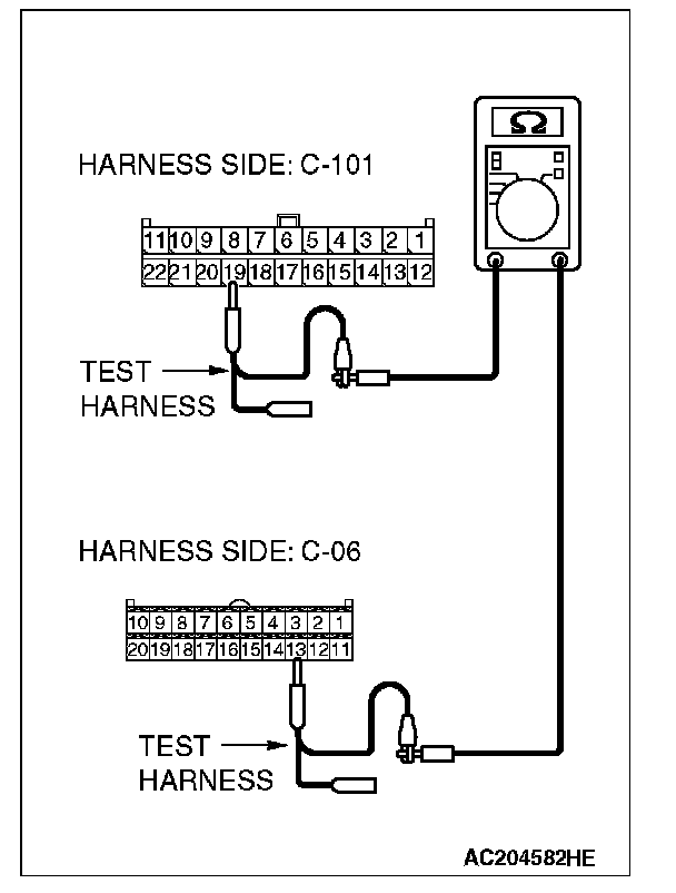 1. Disconnect joint connector (4) C-101 and multi-center display unit (middle-grade type or Mitsubishi Multi Communication System) connector C-06 [multi-center display unit (middle-grade type)] or C-128 [multi-center display unit (Mitsubishi Multi Communication System)], and measure the resistance at the wiring harness sides of joint connector (4) C-101 and multi-center display unit (middle-grade type or vehicles with Mitsubishi multi communication system) connector C-06 [multi-center display unit (middle-grade type)] or C-128 [multi-center display unit (Mitsubishi Multi Communication System)].