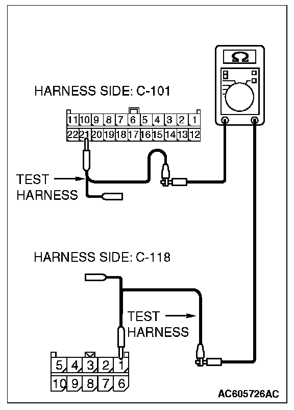 1. Disconnect joint connector (4) C-101 and TPMS receiver connector C-118, and measure the resistances at the wiring harness sides of joint connector (4) C-101 and TPMS receiver connector C-118.