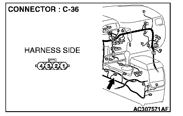 1. Disconnect intermediate connector C-24 and G and yaw rate sensor connector C-36, and measure the resistance between the wiring harness side connector of G and yaw rate sensor connector C-36 and the male side connector of intermediate connector C-24 (at front wiring harness side).