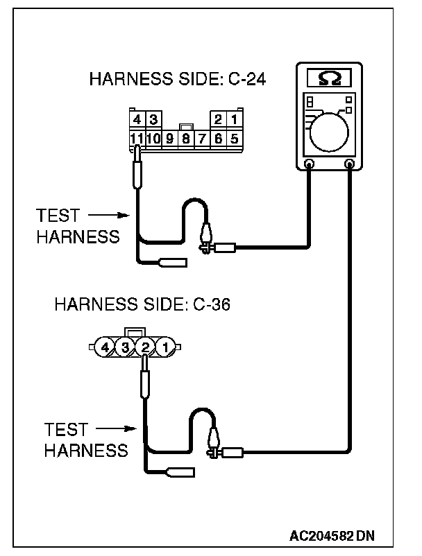 NO : [If either of the resistances measures more than 2 ohms or all the resistances measure more than 2 ohms] Repair the wiring harness wires between intermediate connector C-24 and joint connector (4).