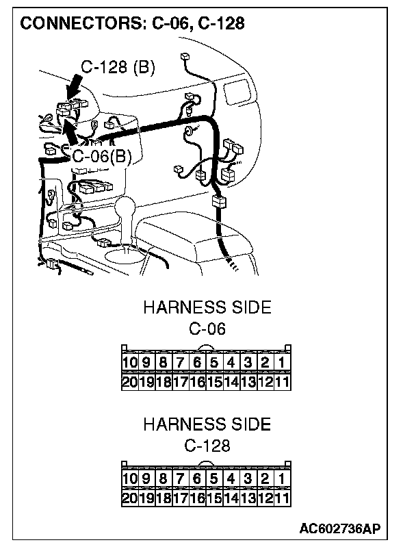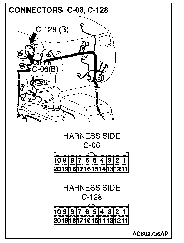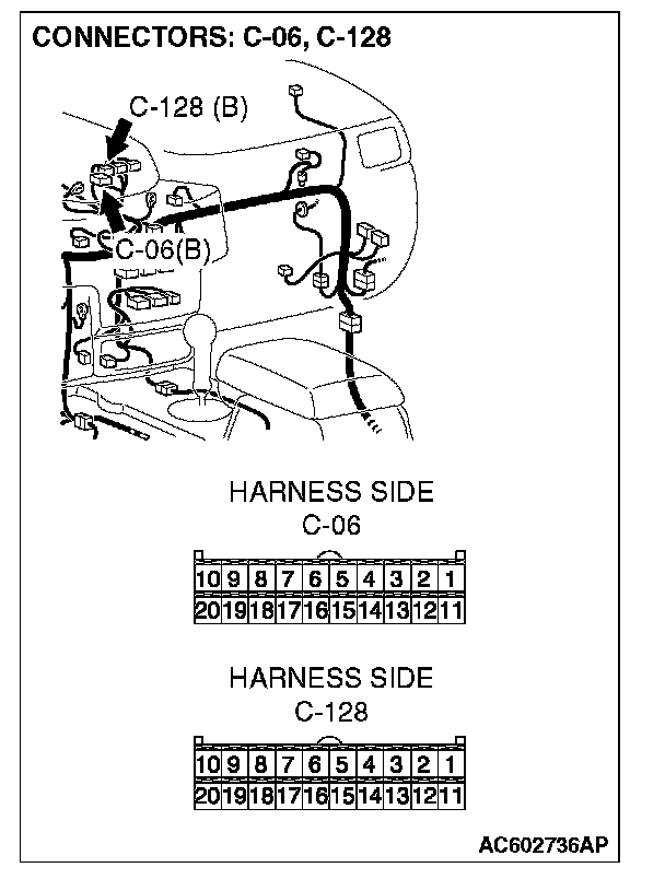 1. Disconnect multi-center display unit (middle-grade type or Mitsubishi Multi Communication System) connector C-06 [multi-center display unit (middle-grade type)] or C-128 [multi-center display unit (Mitsubishi Multi Communication System)].