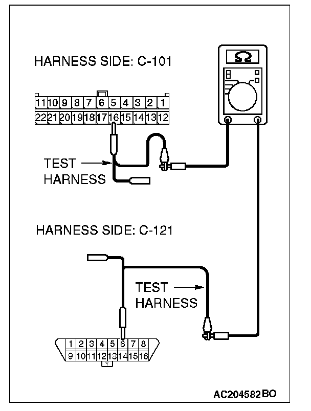 STEP 30. Check the CAN bus lines between joint connector (4) and the multi-center display unit (middle-grade type or Mitsubishi Multi Communication System). Measure the resistance between joint connector (4) C-101 and multi-center display unit (middle-grade type or Mitsubishi Multi Communication System) connector C-06 [multi-center display unit (middle-grade type)] or C-128 [multi-center display unit (Mitsubishi Multi Communication System)]
