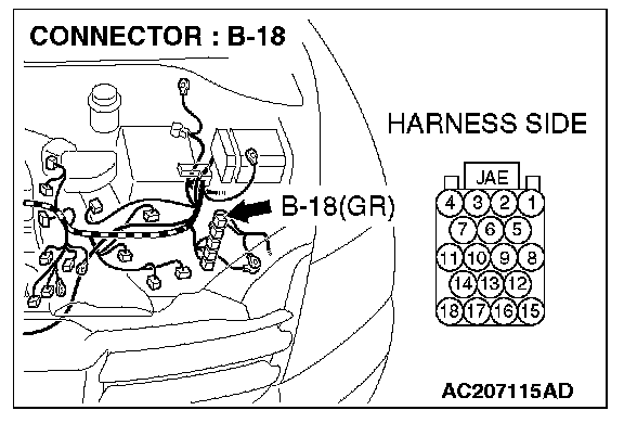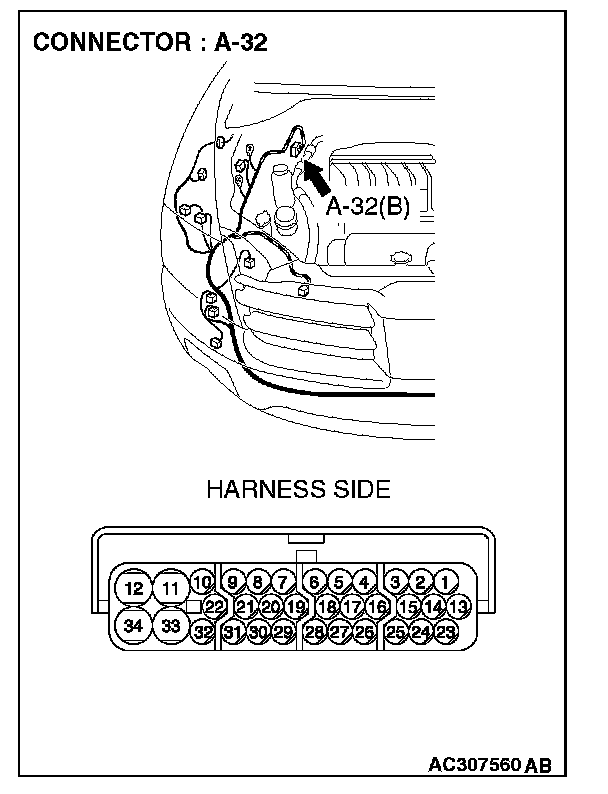1. Disconnect TCL/ASC-ECU connector A-32 and powertrain control module connector B-18, and measure the resistance between each wiring harness side connector.