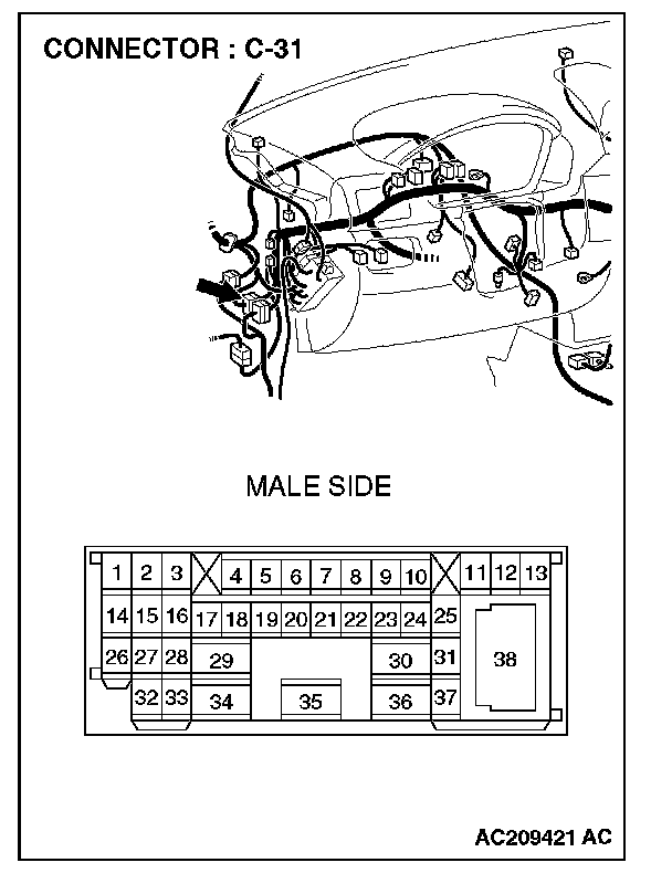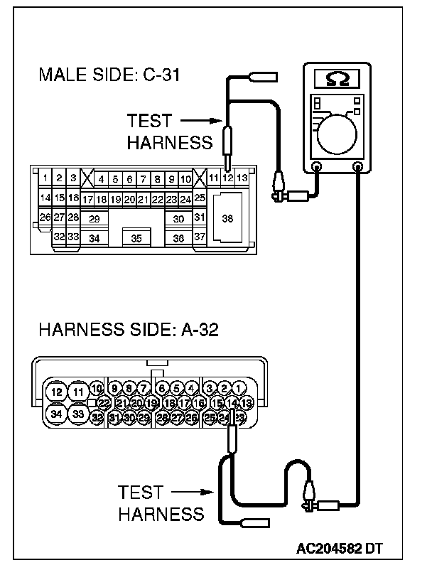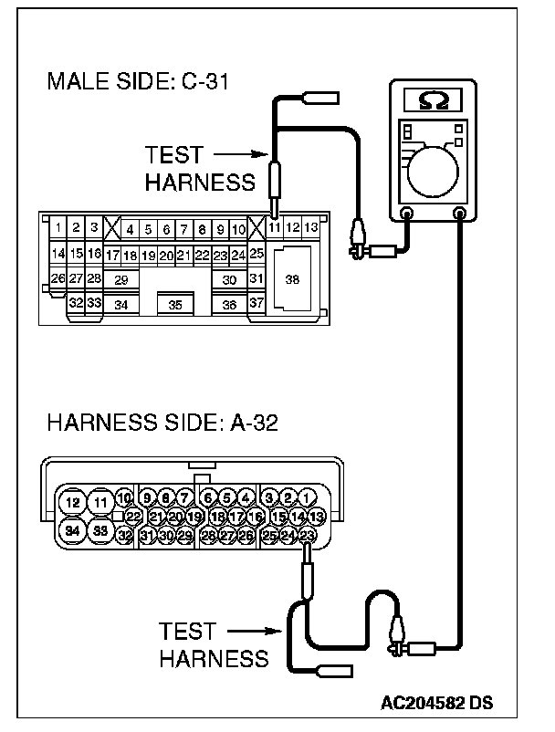 1. Disconnect intermediate connector C-31 and TCL/ASC-ECU connector A-32, and measure the resistance between the wiring harness side connector of TCL/ASC-ECU connector A-32 and the male side connector of intermediate connector C-31 (at front wiring harness side).