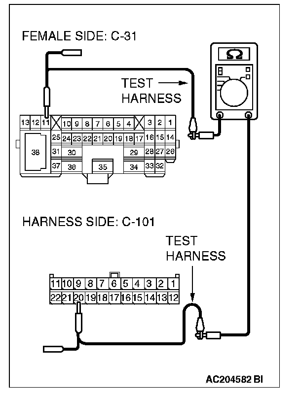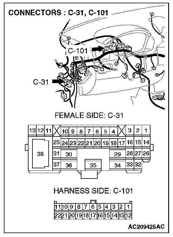 1. Disconnect joint connector (4) C-101 and intermediate connector C-31, and measure the resistance between the wiring harness side connector of joint connector (4) C-101 and the female side connector of intermediate connector C-31 (instrument panel wiring harness side).