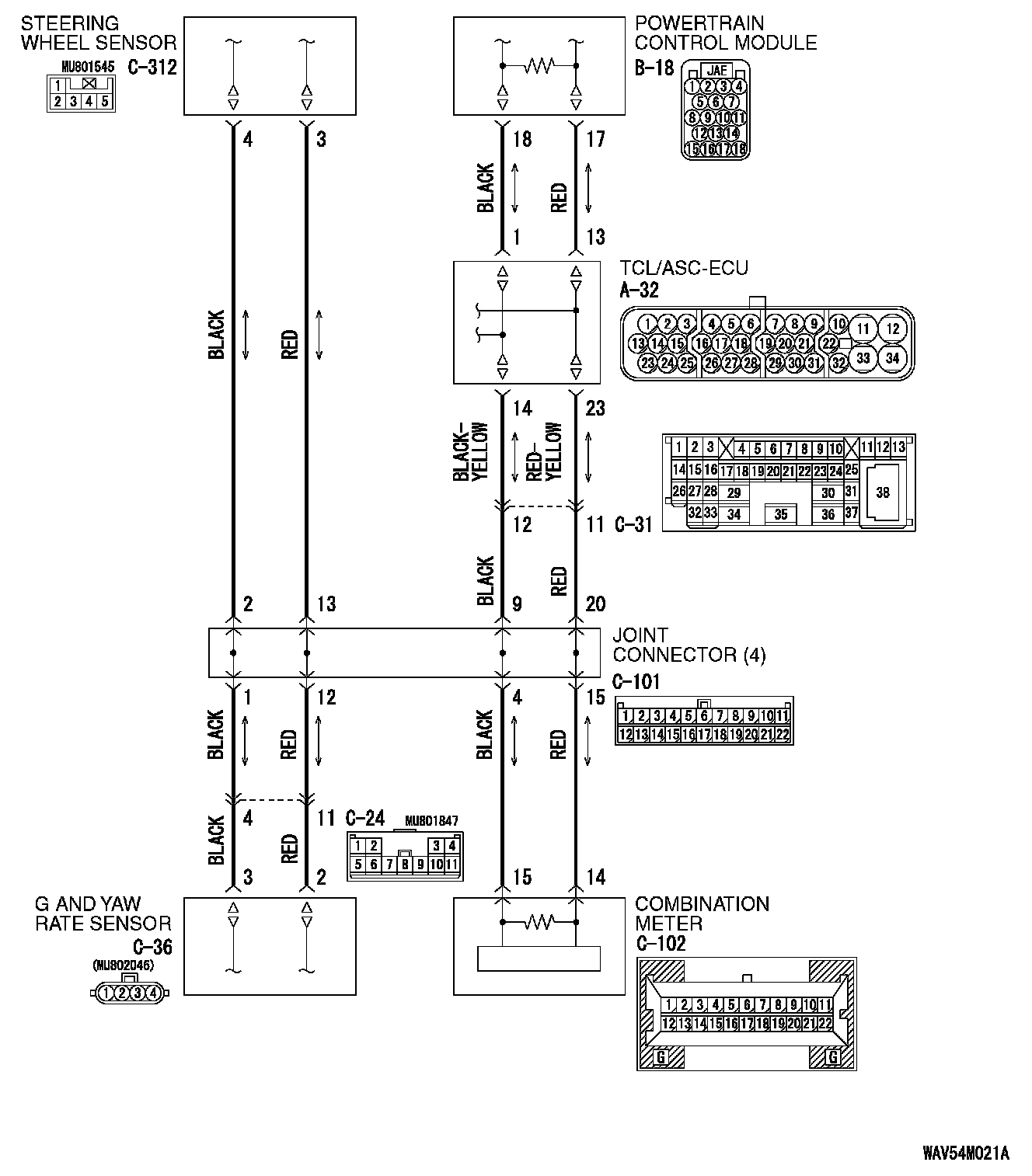 STEP 1. Check intermediate connector C-31, joint connector (4) C-101 and TCL/ASC-ECU connector A-32 for loose, corroded or damaged terminals, or terminals pushed back in the connector.