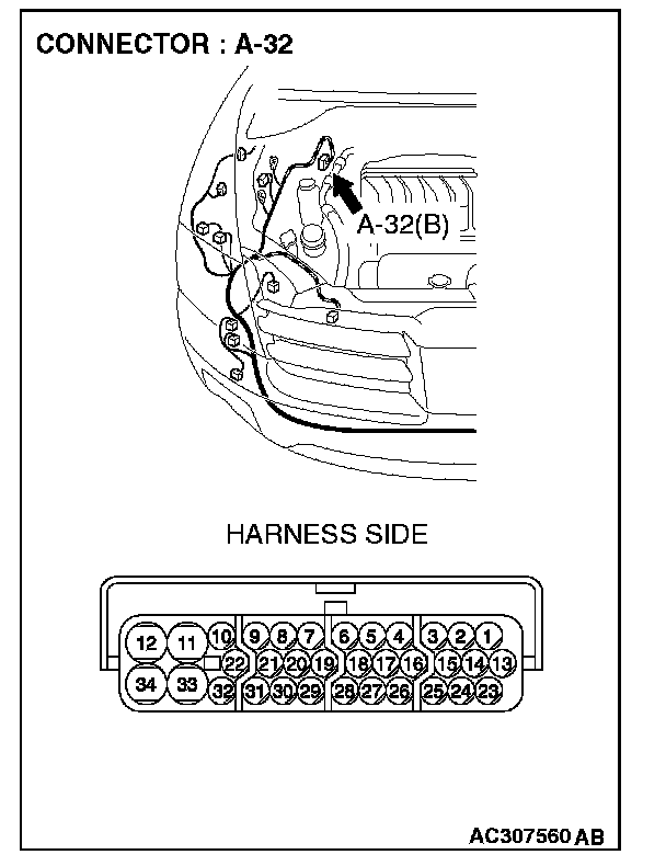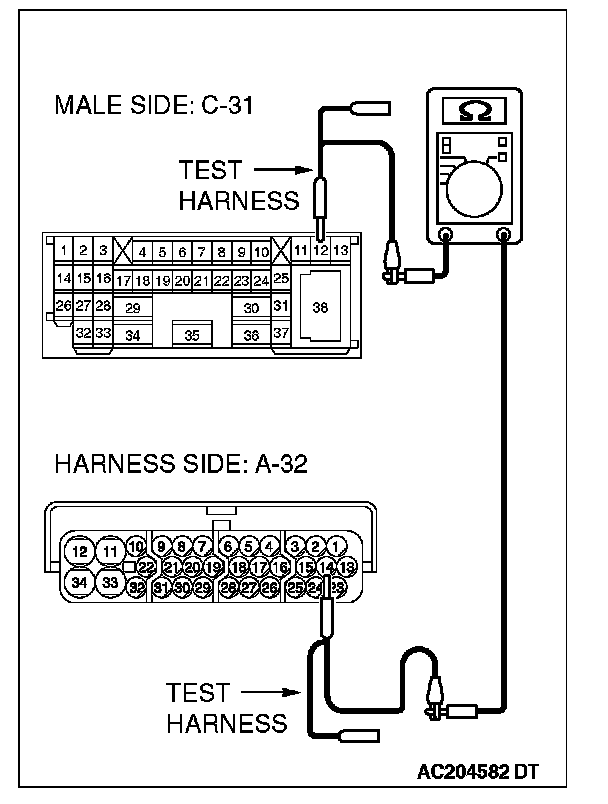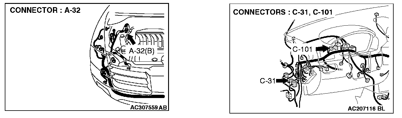 1. Disconnect intermediate connector C-31 and TCL/ASC-ECU connector A-32, and measure the resistance between the wiring harness side connector of TCL/ASC-ECU connector A-32 and the male side connector of intermediate connector C-31 (at front wiring harness side).