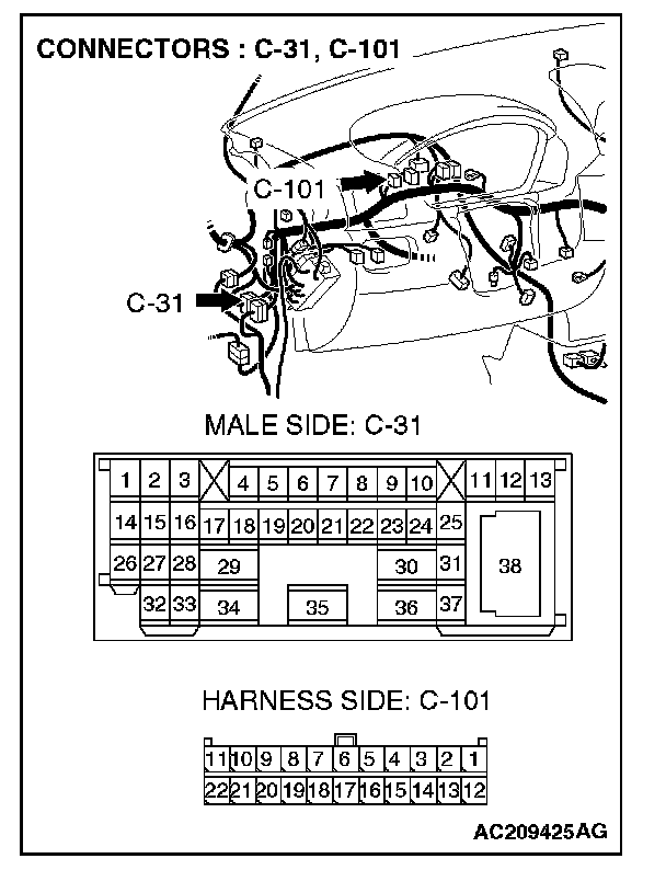 1. Disconnect joint connector (4) C-101 and intermediate connector C-31, and measure the resistance between the wiring harness side connector of joint connector (4) C-101 and the female side connector of intermediate connector C-31 (instrument panel wiring harness side).