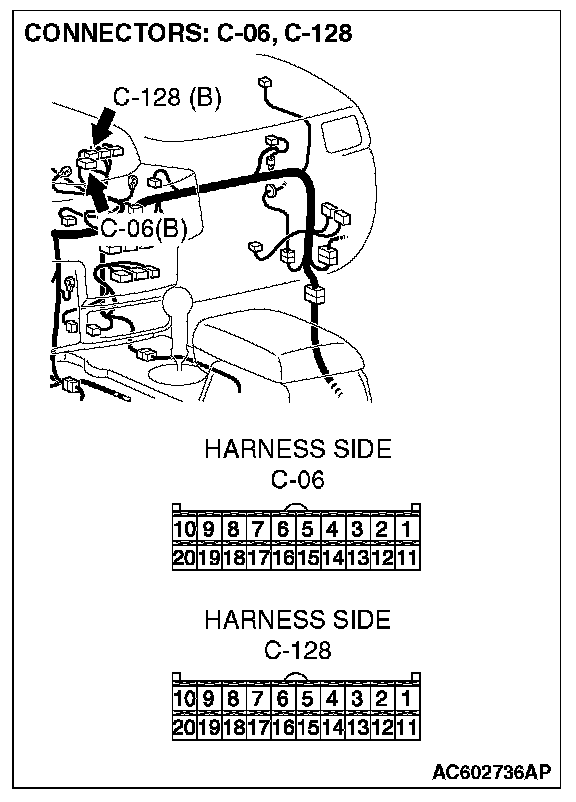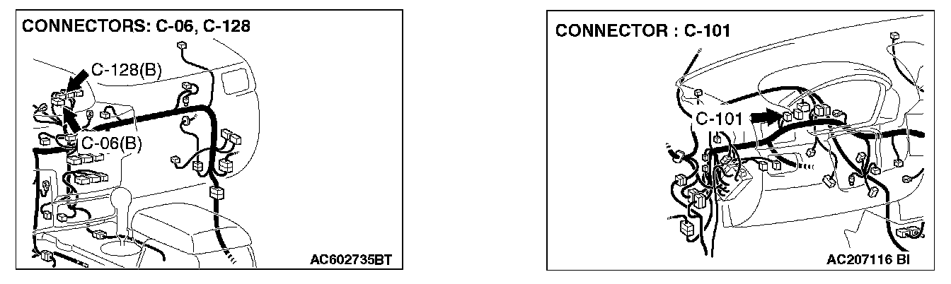 STEP 1. Check joint connector (4) C-101 and multi-center display unit (middle-grade type or vehicles with Mitsubishi multi communication system) connector C-06 [multi-center display unit (middle-grade type)] or C-128 [multi-center display unit (vehicles with Mitsubishi multi communication system)] for loose, corroded or damaged terminals, or terminals pushed back in the connector.