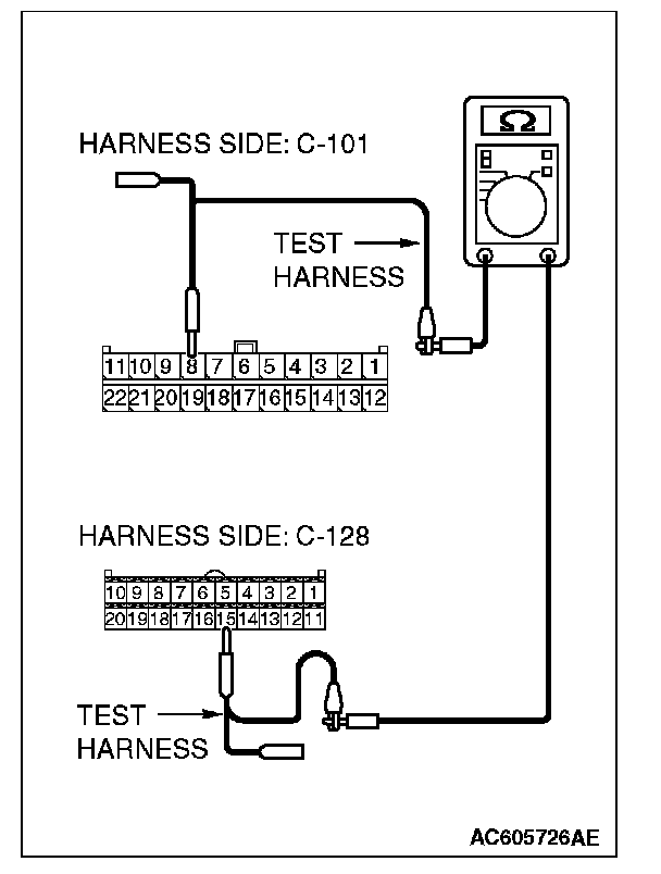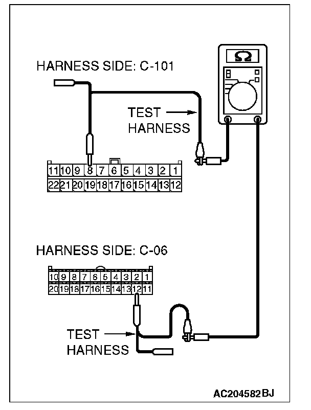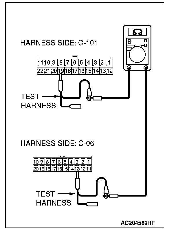 STEP 2. Check the CAN bus lines between joint connector (4) and the multi-center display unit (middle-grade type or vehicles with Mitsubishi multi communication system). Measure the resistance between joint connector (4) C-101 and multi-center display unit (middle-grade type or vehicles with Mitsubishi multi communication system) connector C-06 [multi-center display unit (middle-grade type)] or C-128 [multi-center display unit (vehicles with Mitsubishi multi communication system)].
