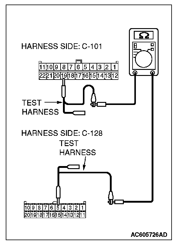 1. Disconnect joint connector (4) C-101 and multi-center display unit (middle-grade type or vehicles with Mitsubishi multi communication system) connector C-06 [multi-center display unit (middle-grade type)] or C-128 [multi-center display unit (vehicles with Mitsubishi multi communication system)], and measure the resistance at the wiring harness sides of joint connector (4) C-101 and multi-center display unit (middle-grade type or vehicles with Mitsubishi multi communication system) connector C-06 [multi-center display unit (middle-grade type)] or C-128 [multi-center display unit (vehicles with Mitsubishi multi communication system)].