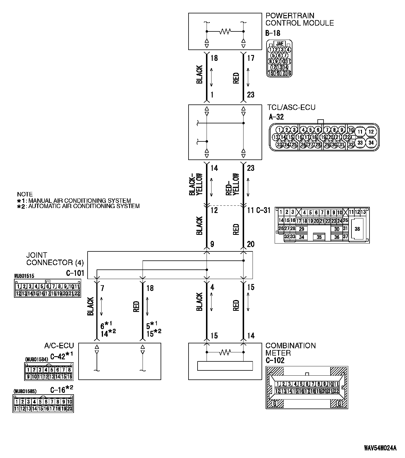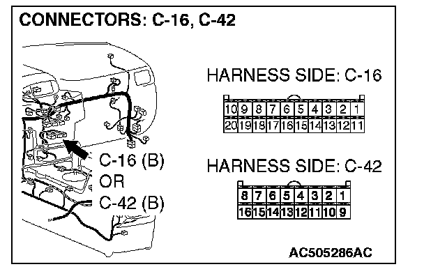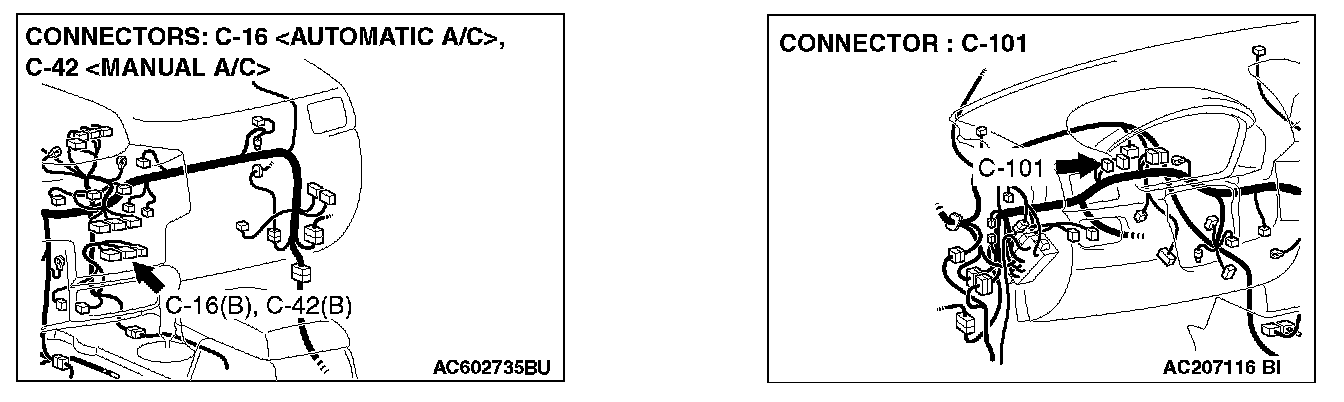 STEP 1. Check joint connector (4) C-101 and A/C-ECU connector C-42 [manual air conditioning system] or A/C-ECU connector C-16 [automatic air conditioning system] for loose, corroded or damaged terminals, or terminals pushed back in the connector.