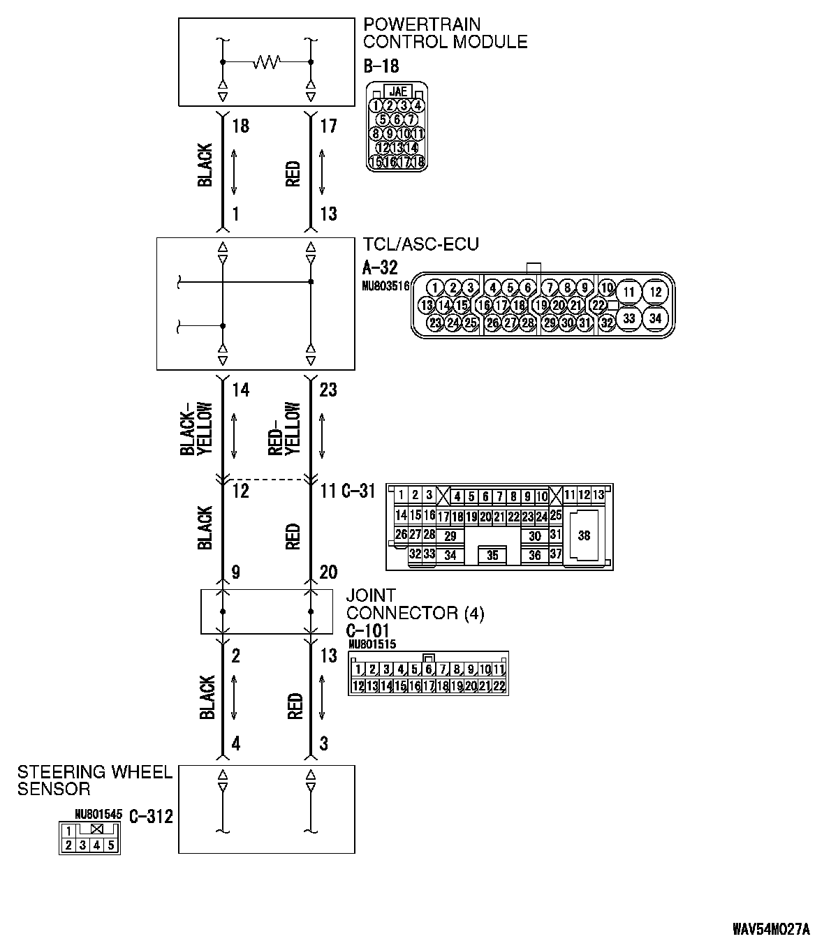 Q: Are joint connector (4) C-101 and steering wheel sensor connector C-312 in good condition?