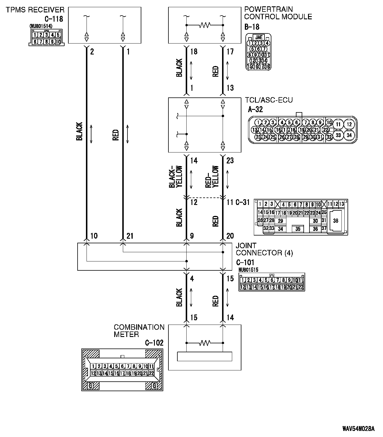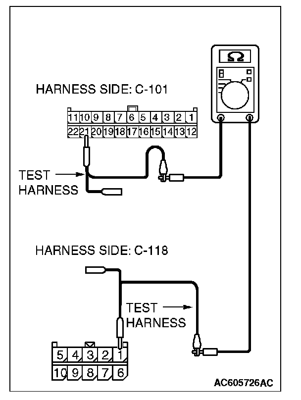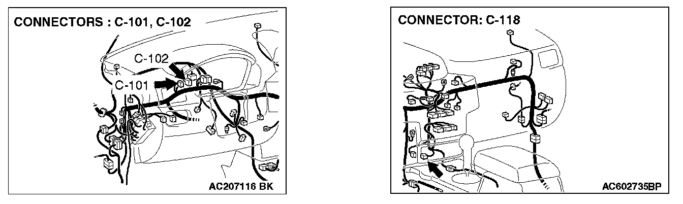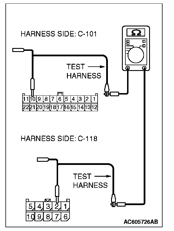 1. Disconnect joint connector (4) C-101 and TPMS receiver connector C-118, and measure the resistances at the wiring harness sides of joint connector (4) C-101 and TPMS receiver connector C-118.