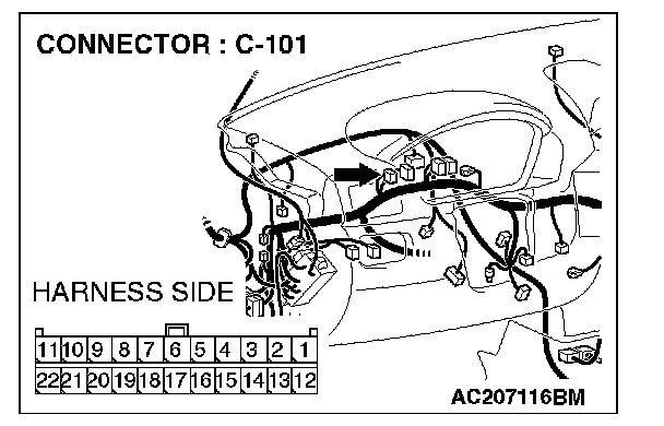 1. Disconnect joint connector (4) C-101 and multi-center display unit (middle-grade type or Mitsubishi Multi Communication System) connector C-06 [multi-center display unit (middle-grade type)] or C-128 [multi-center display unit (Mitsubishi Multi Communication System)], and measure the voltage at the wiring harness side of joint connector (4) C-101.