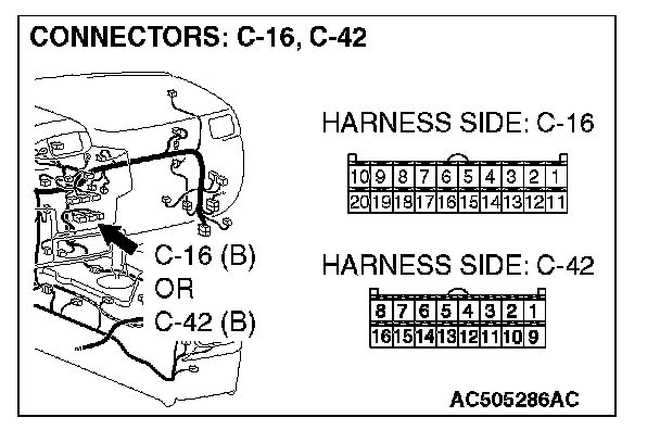 STEP 46. Check A/C-ECU connector C-42 [manual air conditioning system] or A/C-ECU connector C-16 [Automatic air conditioning system] for loose, corroded or damaged terminals, or terminals pushed back in the connector.