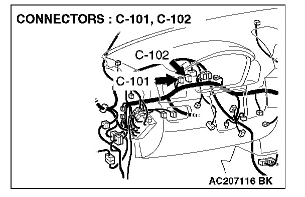 STEP 1. Check joint connector (4) C-101 and combination meter connector C-102 for loose, corroded or damaged terminals, or terminals pushed back in the connector.