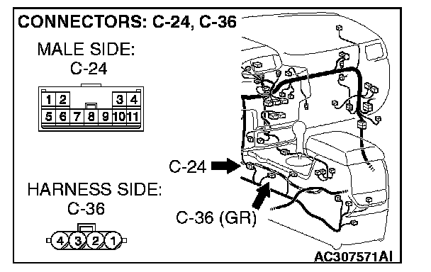 1. Disconnect intermediate connector C-24 and G and yaw rate sensor connector C-36, and measure the resistance at the wiring harness side of intermediate connector male side (at front wiring harness side).