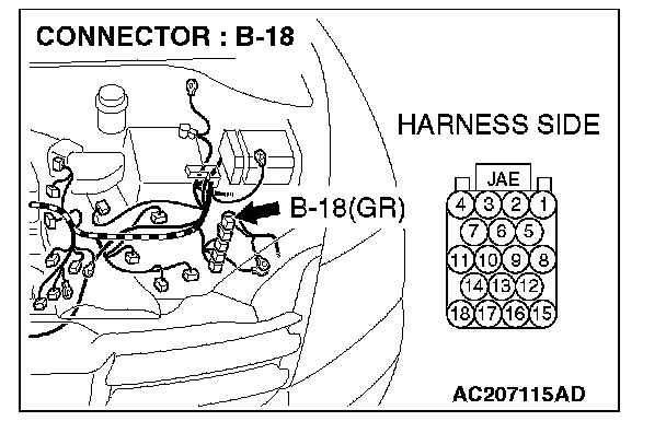 1. Disconnect powertrain control module connector B-18 and TCL/ASC-ECU connector A-32, and measure the resistance at the harness side of powertrain control module connector B-18.