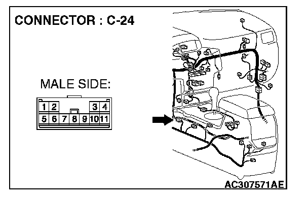 1. Disconnect intermediate connector C-24 and G and yaw rate sensor connector C-36, and measure the resistance at the wiring harness side of intermediate connector male side (at front wiring harness side).