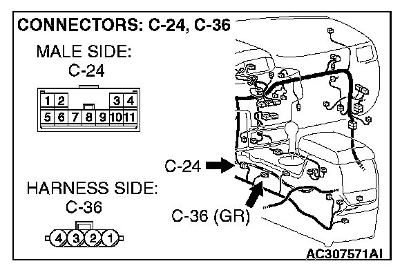 STEP 25. Check G and yaw rate sensor connector C-36 and intermediate connector C-24 for loose, corroded or damaged terminals, or terminals pushed back in the connector.