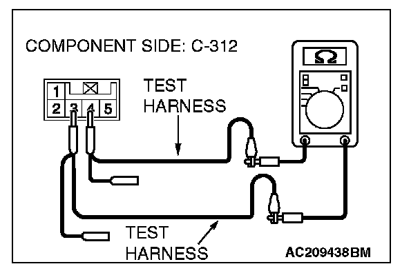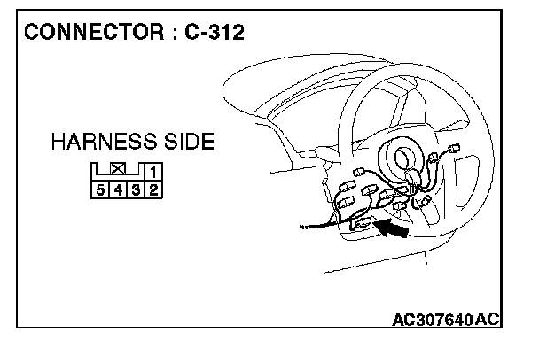 1. Disconnect steering wheel sensor connector C-312, and measure the resistance at the equipment side of steering wheel sensor connector C-312.