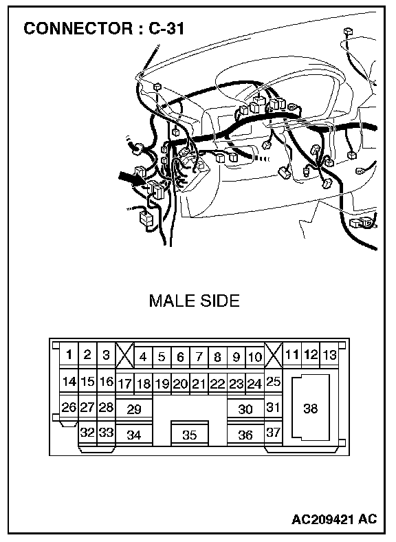 1. Disconnect intermediate connector C-31 and TCL/ASC-ECU connector A-32, and measure the resistance at the male side of intermediate connector C-31 (at front wiring harness side).