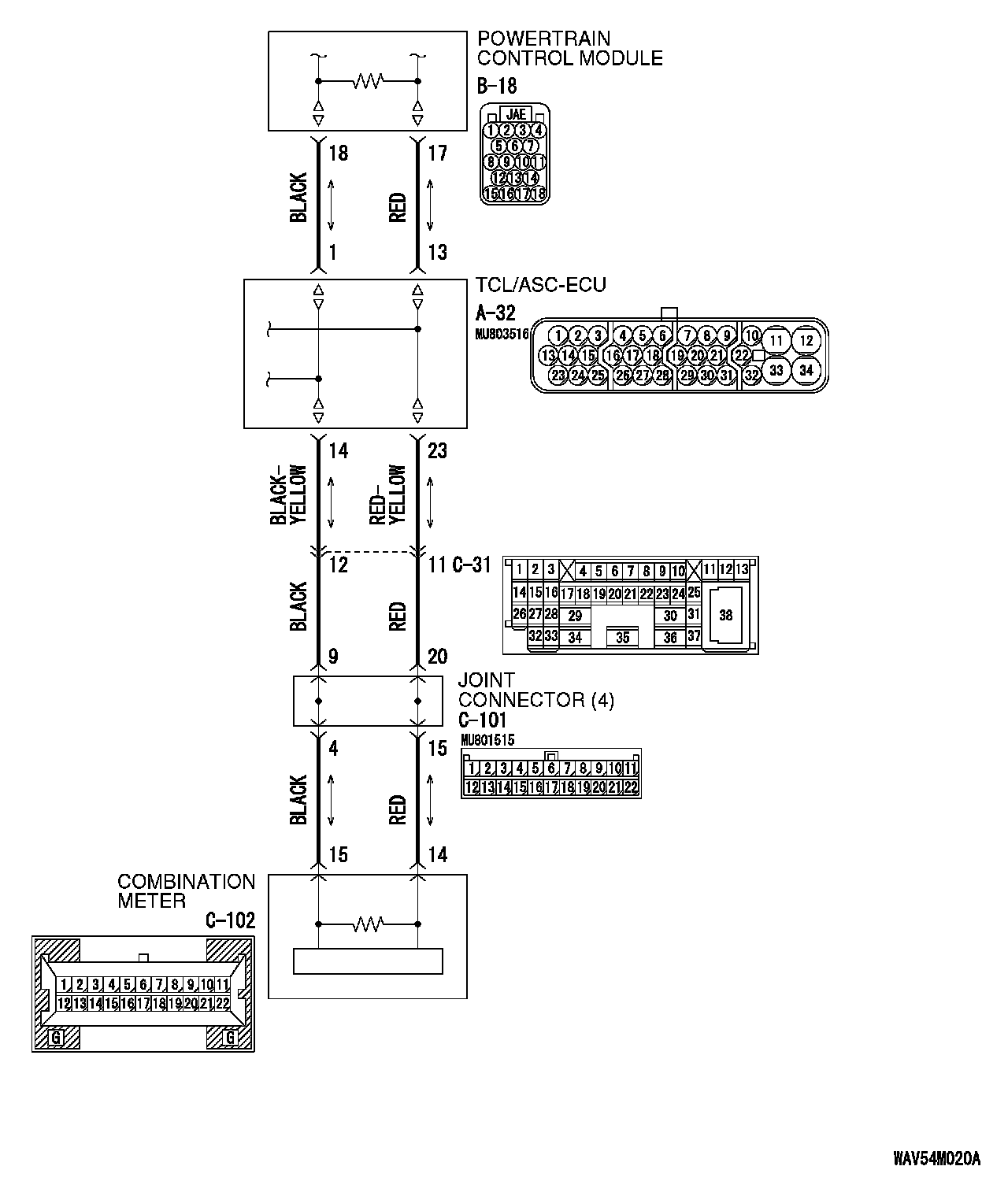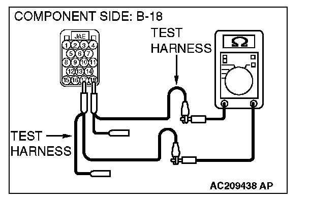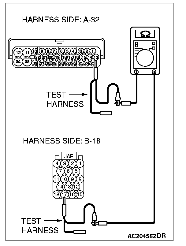 1. Disconnect TCL/ASC-ECU connector A-32 and powertrain control module connector B-18, and measure the resistance between each wiring harness side connector.