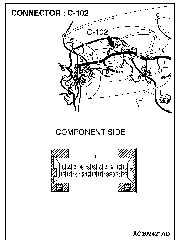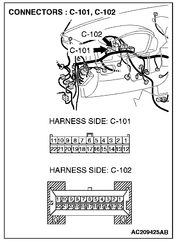 STEP 3. Check joint connector (4) C-101 and combination meter connector C-102 for loose, corroded or damaged terminals, or terminals pushed back in the connector.