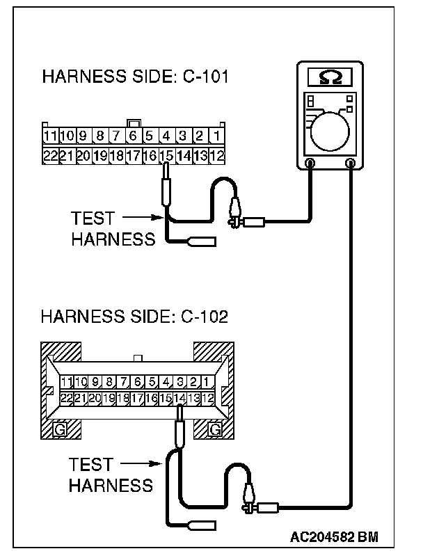 1. Disconnect joint connector (4) C-101 and combination meter connector C-102, and measure the resistance between each wiring harness side connector.
